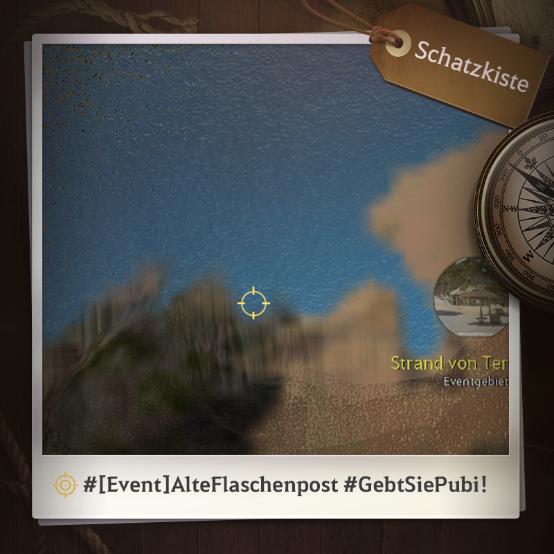 Sucht beim Schiffswrack in der Nähe der blauen Muschel nach der Schatzkiste und interagiert mit ihr, um die „[Event] Alte Flaschenpost“ zu erhalten.