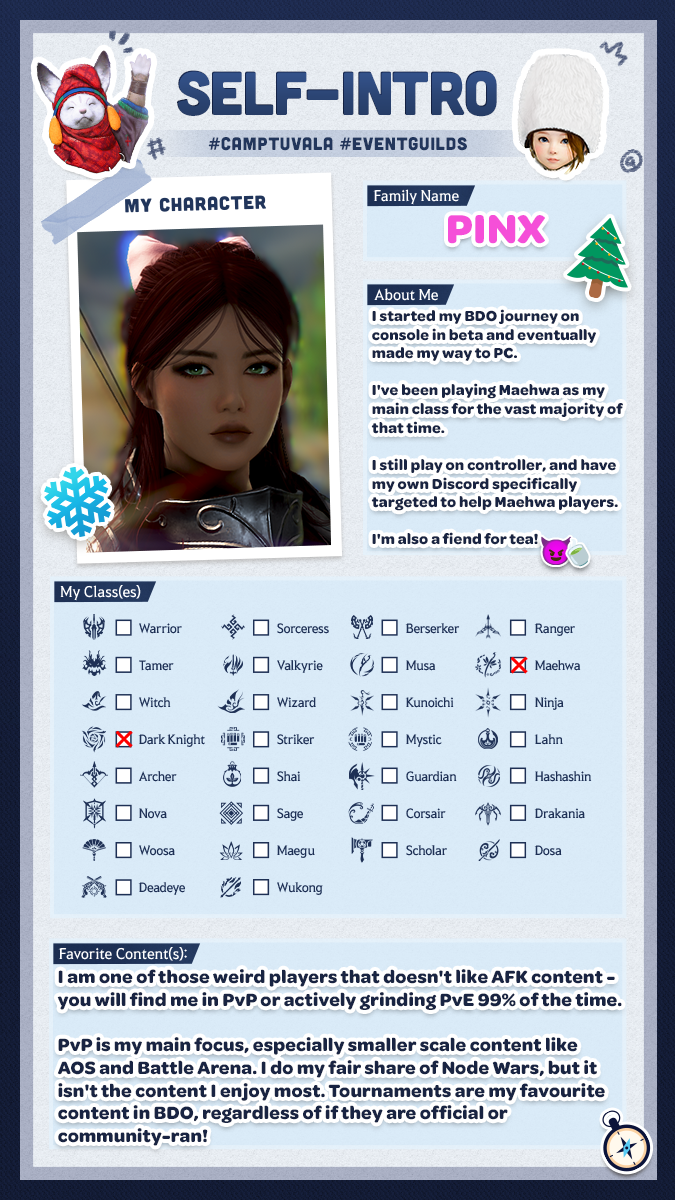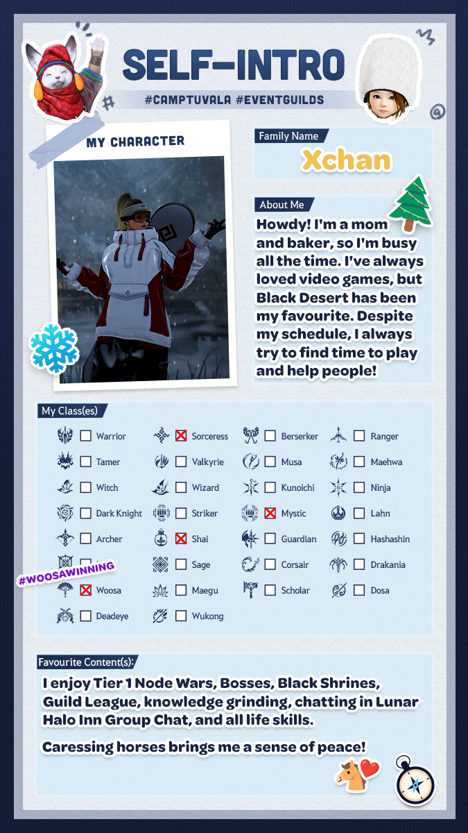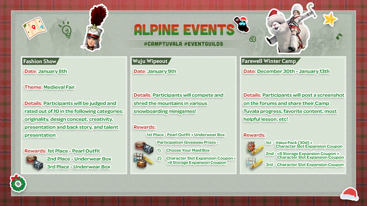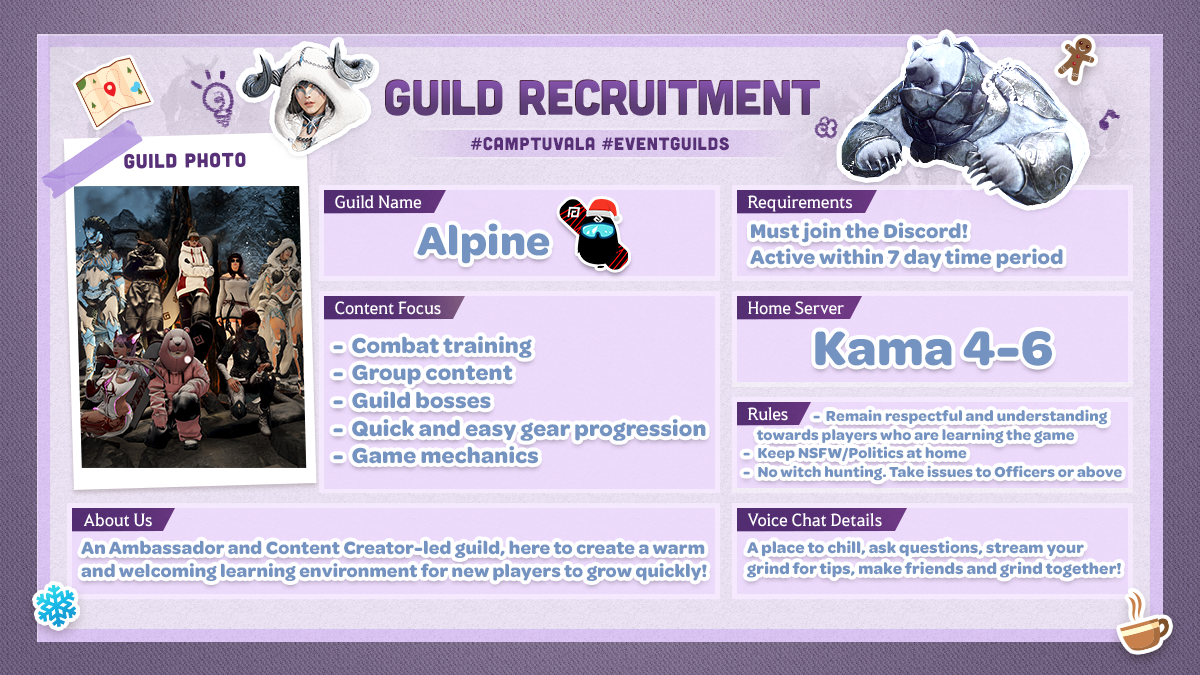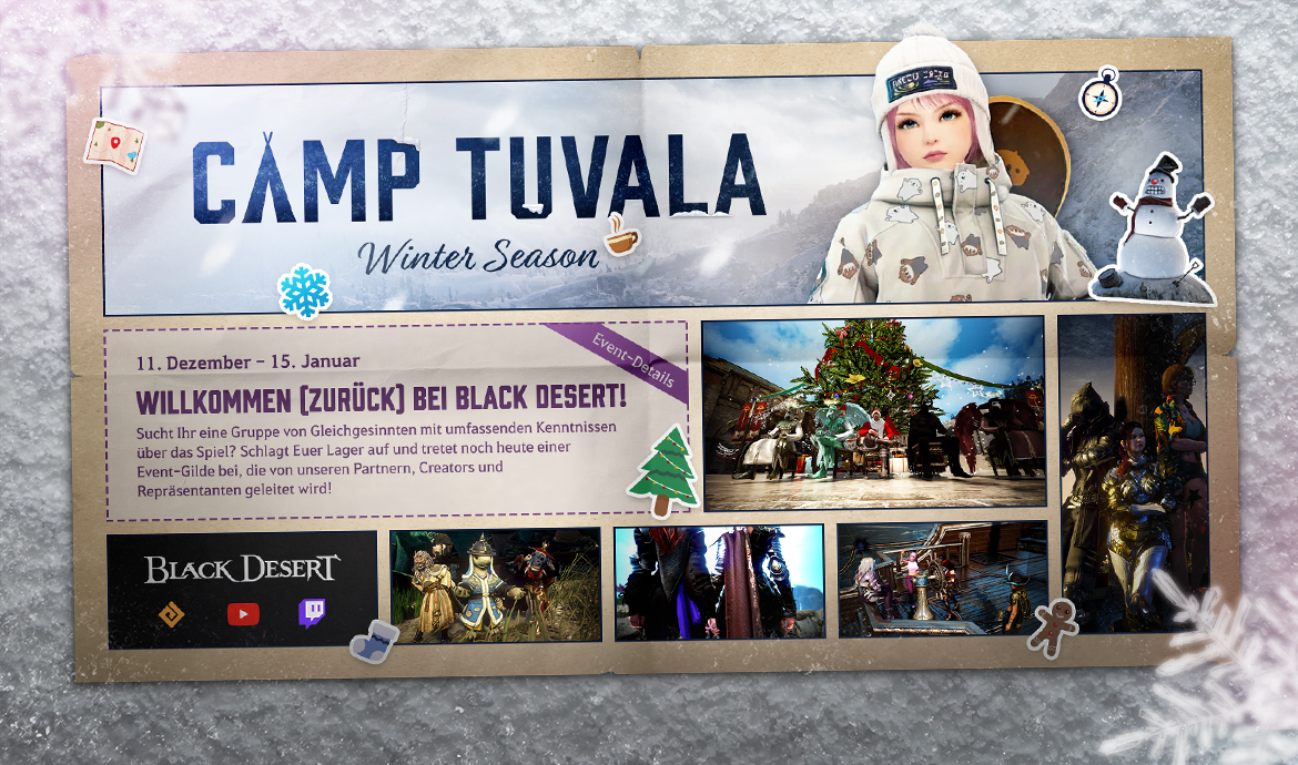 Schließt Euch diesen Winter mit den erfahrensten Abenteurern zusammen und brecht gemeinsam auf ein aufregendes Abenteuer auf! Tretet einer Wachstumsgilde, die von unseren Black Desert-Partnern, -Content Creatorn und -Repräsentanten geleitet wird, bei, um Hilfestellungen, Unterstützung und Zusammenhalt beim Fortschritt durchs Spiel zu erhalten.