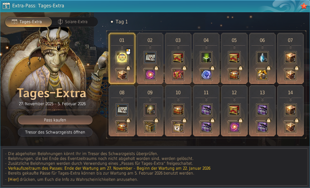 Schaltet zusätzliche Belohnungen frei, indem Ihr den Pass für Tages-Extra aus dem Perlenladen kauft!