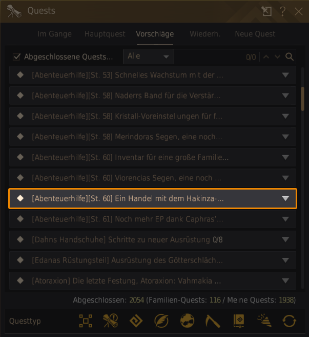 - Die Quest „[Event] Ein Handel mit dem Hakinza-Tempel“ wurde in den Vorschläge-Tab im Questfenster (O) verschoben und der Name der Quest wurde zu „[Abenteuerhilfe][St. 60] Ein Handel mit dem Hakinza-Tempel“ geändert.