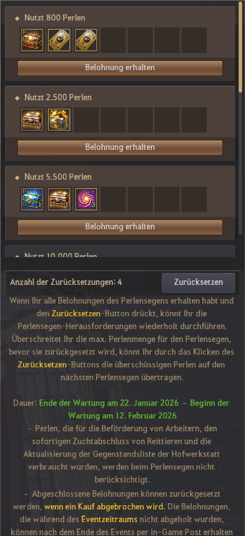 ▲ Sobald Ihr alle Belohnungen des Perlensegens beansprucht habt, klickt auf den Button „Zurücksetzung“, um erneut zu starten!