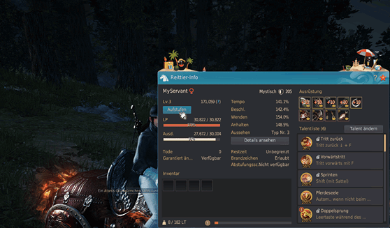 - Das Reittierwachstum könnt Ihr im Stall oder in der Reittier-Info durchführen.