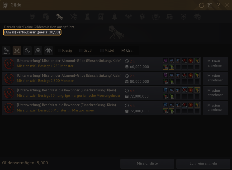 - Wählt bei der Suchfunktion links von der Minikarte „Gilde“ aus, um die Wegfindung zu einem Gildenverwalter zu aktivieren.