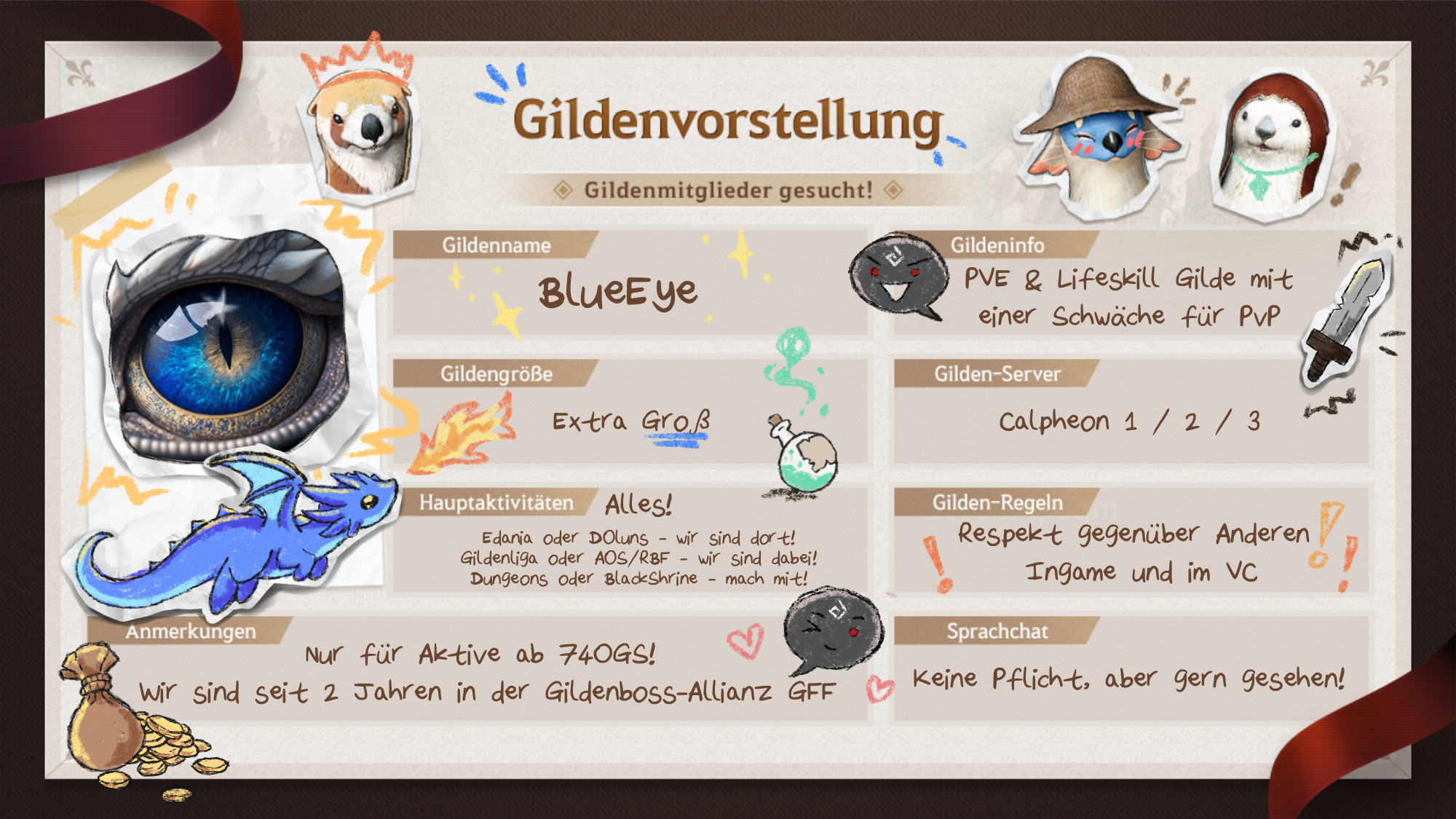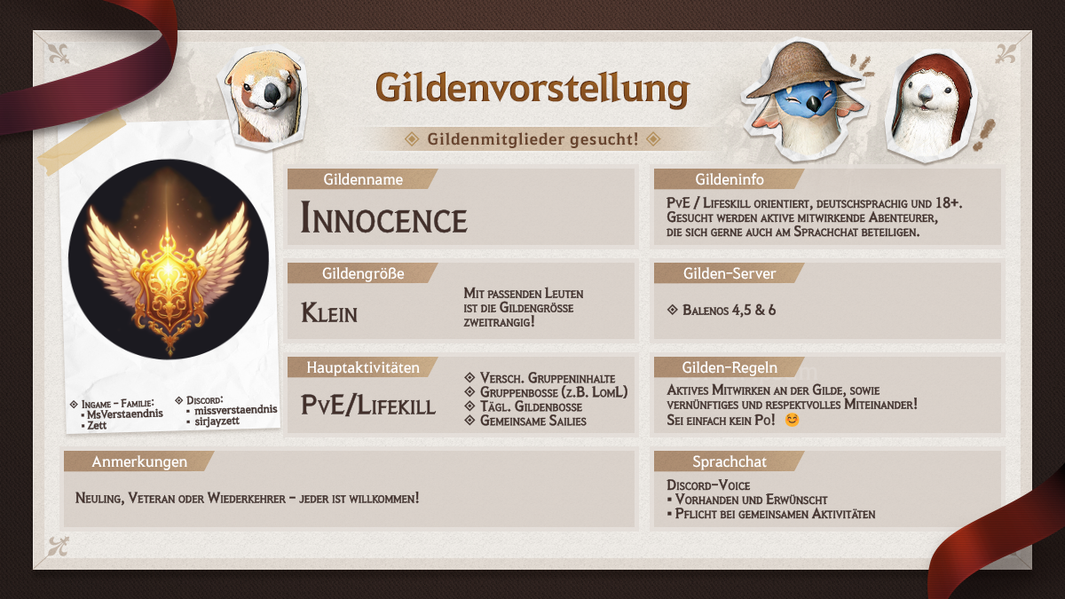* Ihr könnt die Karten zur Gildenvorstellung in unserem Discord in den folgenden Sprachen finden: Deutsch, Englisch, Französisch und Spanisch.