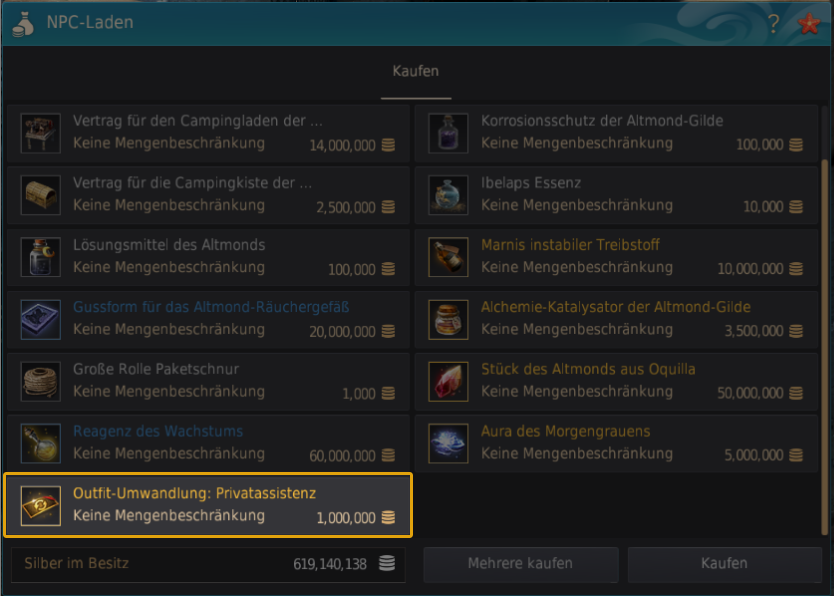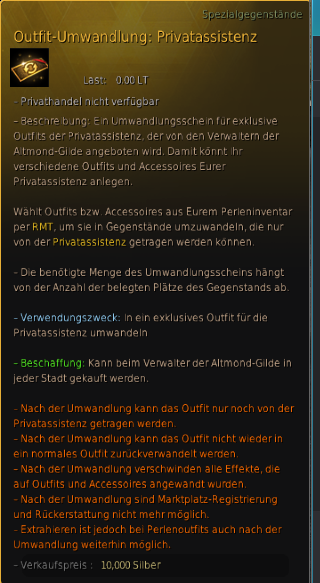 - Die Outfit-Umwandlung: Privatassistenz kann für 1.000.000 Silber bei den Verwaltern der Altmond-Gilde in den verschiedenen Dörfern und Großstädten gekauft werden.
