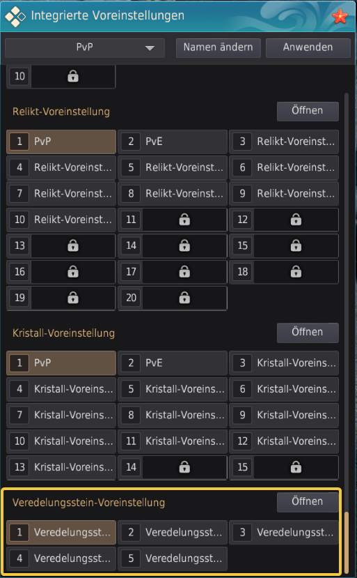 - Es ist jetzt möglich, Veredelungssteine als Voreinstellungen festzulegen und zu verwenden; sie wurden auch in die integrierten Voreinstellungen aufgenommen.