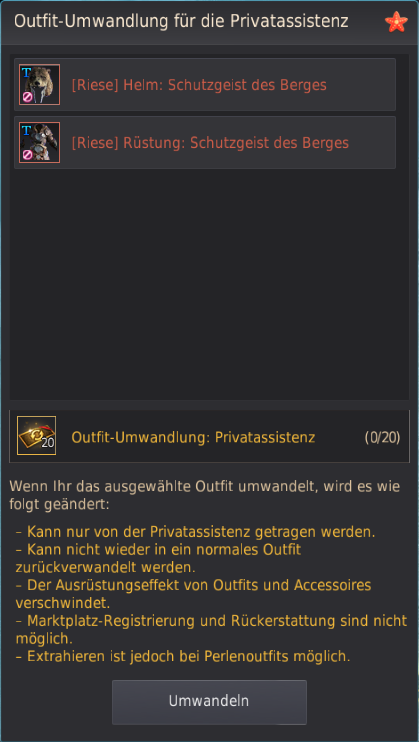 - Eine Rückumwandlung in ein für den Charakter ausrüstbares Outfit ist nicht möglich.