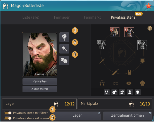 - Im Tab „Privatassistenz“ der Magd-/Butlerliste stehen Euch verschiedene Funktionen rund um die Privatassistenz zur Verfügung.