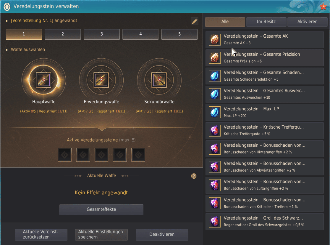 - Veredelungssteine müssen jeweils für Hauptwaffe, Erweckungswaffe und Sekundärwaffe registriert werden und jeder Slot muss einzeln aktiviert werden.