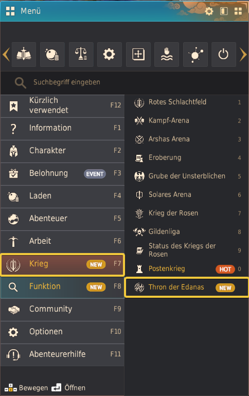 - Im Menü (ESC) – Krieg (F7) wurde die Möglichkeit hinzugefügt, das „Thron der Edanas“-UI zu öffnen.