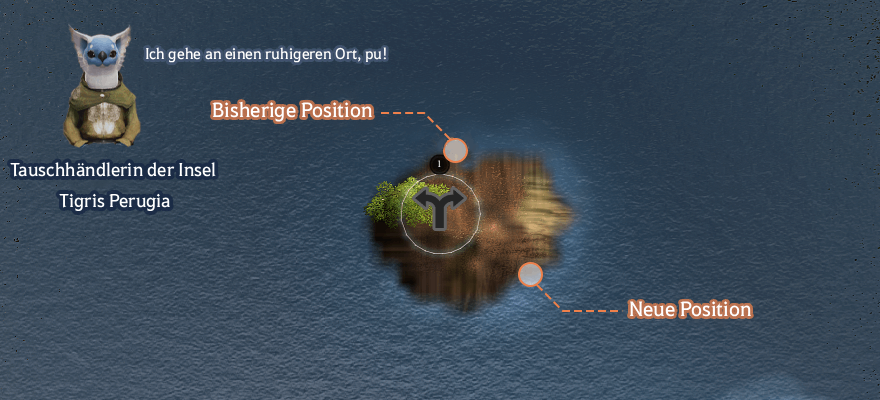- Perugia, die Tauschhändlerin der Insel Tigris, hat ihren Aufenthaltsort auf eine ruhigere Stelle der Insel verlegt, da sich in letzter Zeit immer mehr Angler auf der Tigris-Insel versammeln.