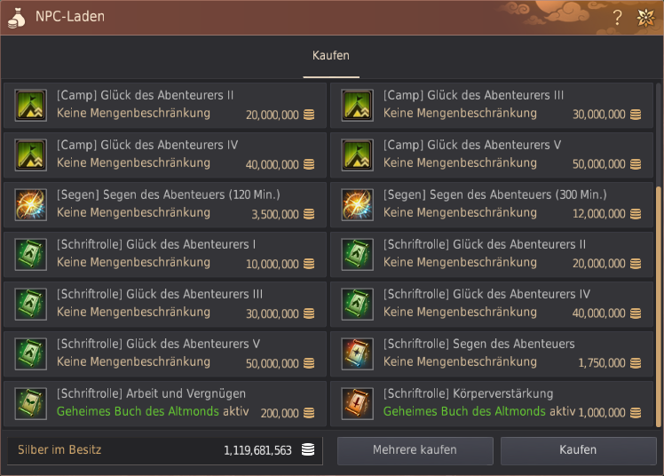 - [Schriftrolle] Arbeit und Vergnügen und [Schriftrolle] Körperverstärkung können nur gekauft werden, wenn das Geheime Buch des Altmonds aktiv ist. (Die Campinglager-Buffs, die keine Schriftrollen sind, können wie bisher gekauft werden, wenn man eine Villa-Einladung besitzt.)