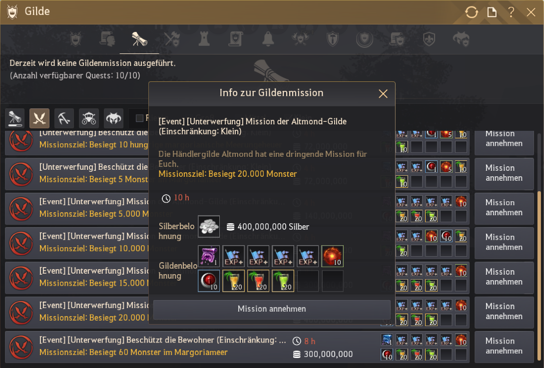 * Nur Gildenmitglieder mit den Befugnissen zur Annahme/dem Abschluss von Gildenmissionen können diese Missionen annehmen. Nachdem die Mission gestartet wurde, können alle Gildenmitglieder zur Erreichung des Zieles beitragen.