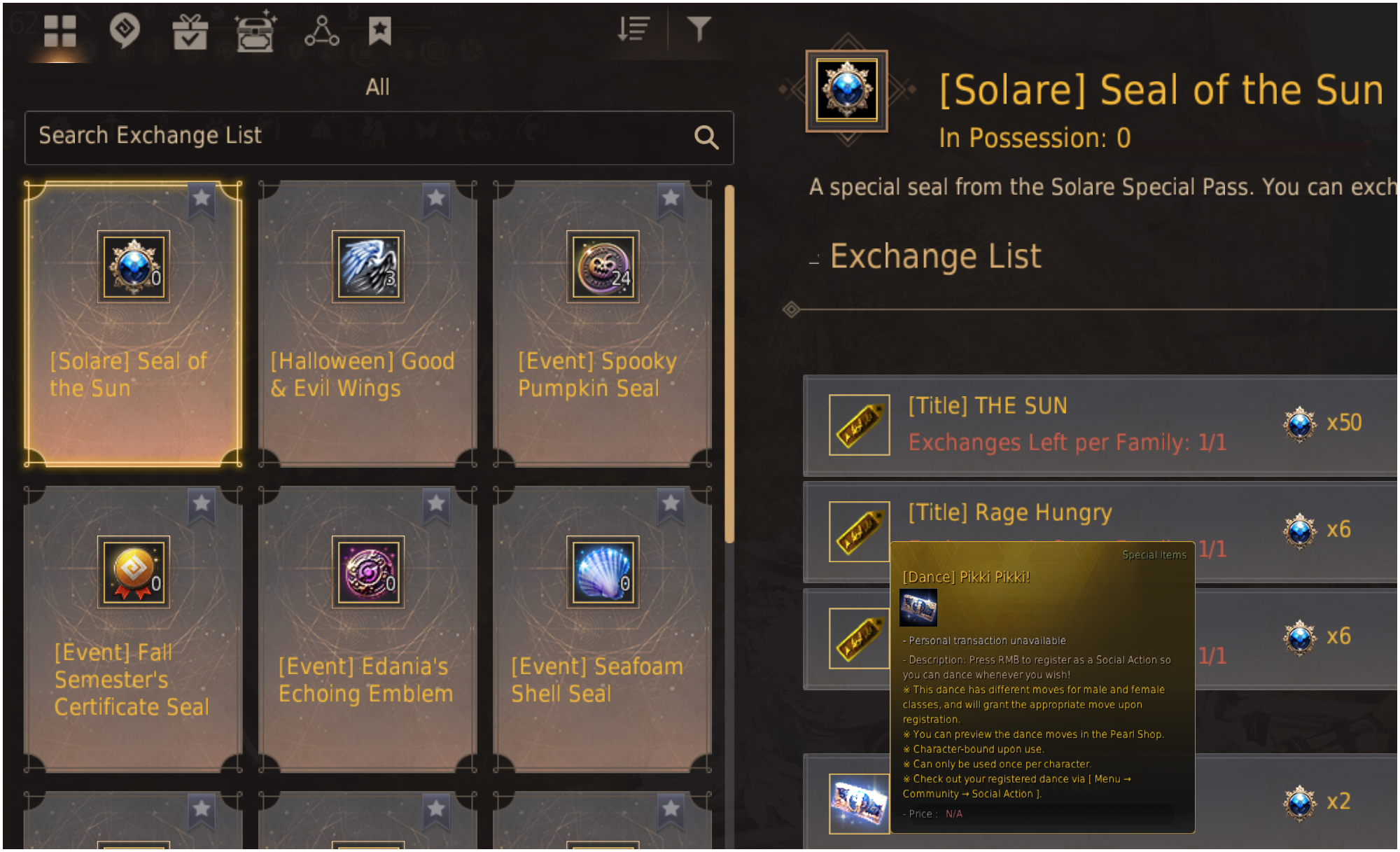 The Currency tab in-game does not specify the classes that are restricted from receiving the Dance rewards, and if you spend the token the GM's, in their infinite wisdom, continue to refuse to reward you back the token. The issue here is the In-game AOS tool tips state nothing about certain classes being restricted. Only that the dances for male and female avatars are different. There is no way to know from the in-game AOS tool tip which are class-based restricted. The tool tip below is the generic tool tip on all the [Solare] Seal of the Sun Dance Rewards. IT in no way states any Class restrictions ..