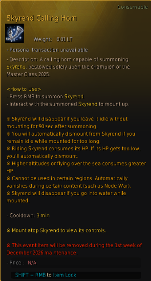 - The "Skyrend Calling Horn" is awarded to Master Class winners. It can be used to summon the Skyrend mount.