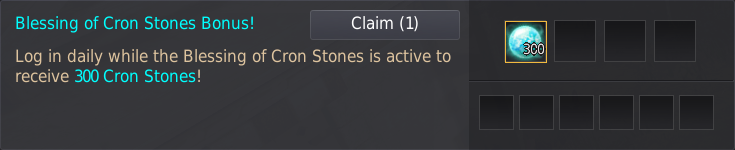 - While the Blessing of Cron Stones is active (7 days), log in daily to claim Cron Stone x300 via Challenge (Y).