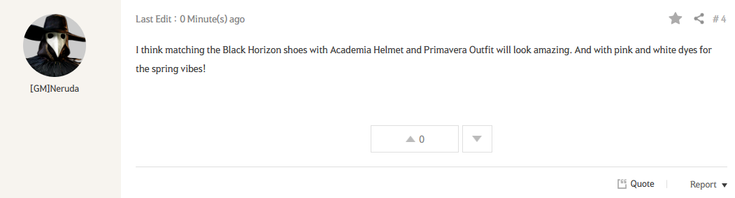 I think matching the Black Horizon shoes with Academia Helmet and Primavera Outfit will look amazing. And with pink and white dyes for the spring vibes!