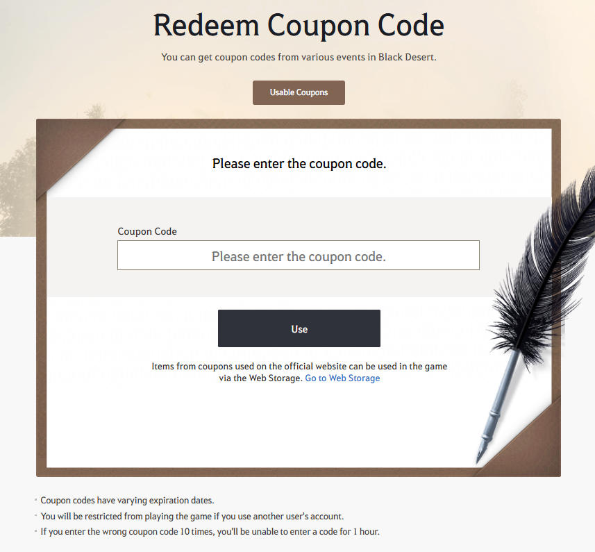 Enter your code via [Use Coupon] to receive your rewards via in-game mail.