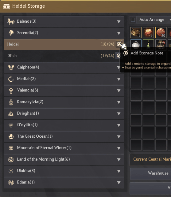 As the world of Black Desert expanded, so have your needs for storage. Because of this, we've received feedback from Adventurers that they found it difficult to keep track of where all the items are among large amounts of items they keep in their expanded storage. To address this, we have added a Storage Note function that allows you to note down the purpose of each storage and easily identify information you need.