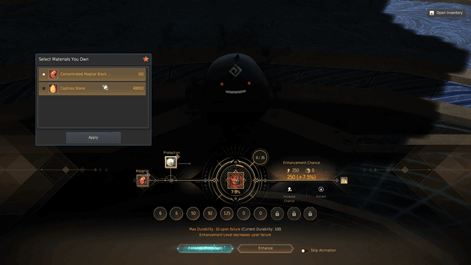 - You can set Caphras enhanceable gear as the target, select Caphras Stones as the material, then perform Caphras Enhancement.