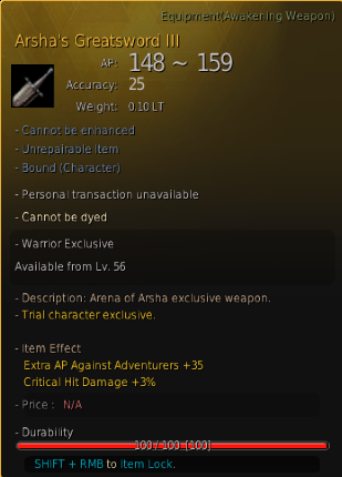 - After completing the “[Trial Character] Proof of Greater Power" quest from the Black Spirit (/), unlock purchase and opening of Arsha's Chest III via Battle Arena NPC Haz's shop
