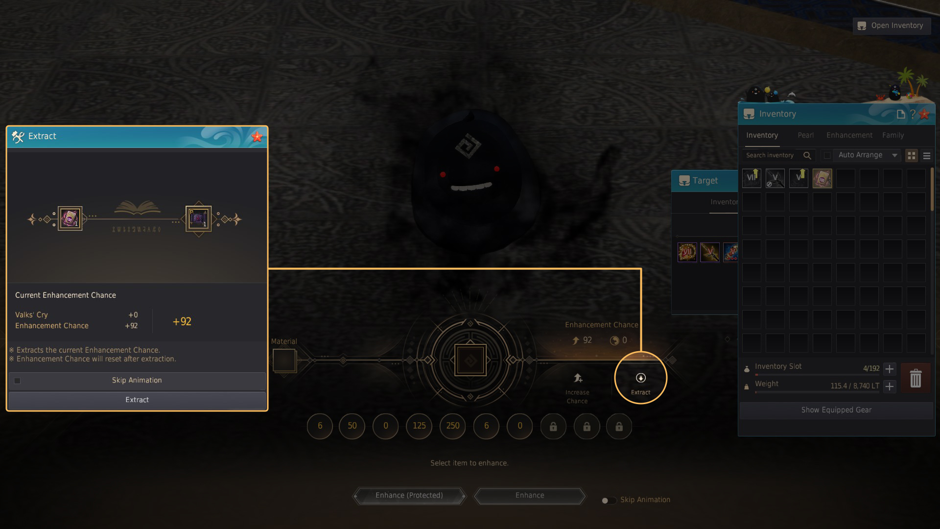 - 'Press the "Extract" area to convert the current Enhancement Chance into an item.