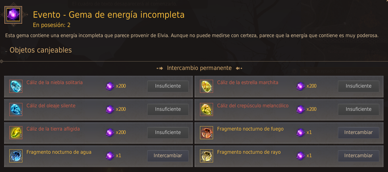 | Objetos intercambiables | Gemas de energía incompleta requeridas |