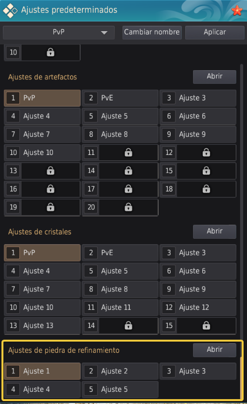 - Si registras una piedra de refinamiento desde el inventario con clic derecho, podrás seleccionarla y usarla en los ajustes predeterminados.