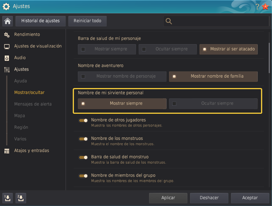 - Puedes elegir si mostrar o no el nombre de tu sirviente desde «ESC → Ajustes → Mostrar/Ocultar → Nombre de mi sirviente personal».