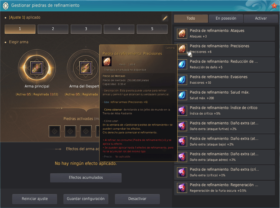 - Debes registrar una piedra de refinamiento para cada tipo de arma: principal, secundaria y del Despertar, y activar la piedra en cada casilla correspondiente.