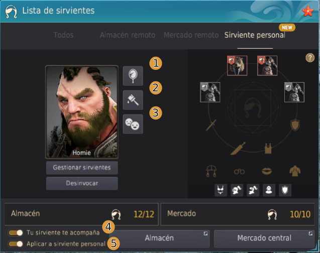 - En la pestaña «Sirviente personal» de la lista de sirvientes, tendrás acceso a varias funciones relacionadas con tu sirviente personal.