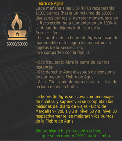 ▲ El progreso en el Libro de Margahan permite aumentar la cantidad máxima de puntos de Fiebre de Agris y su recarga diaria.
