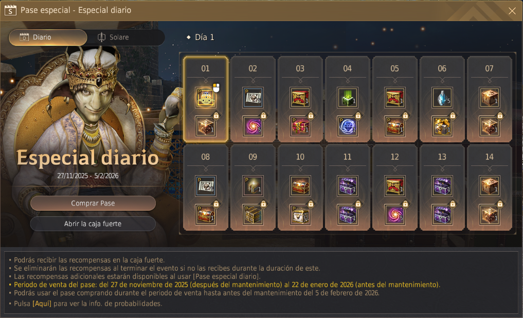 - Las recompensas del Pase especial diario sin usar se borrarán cuando termine el periodo de obtención de recompensas especiales diarias.