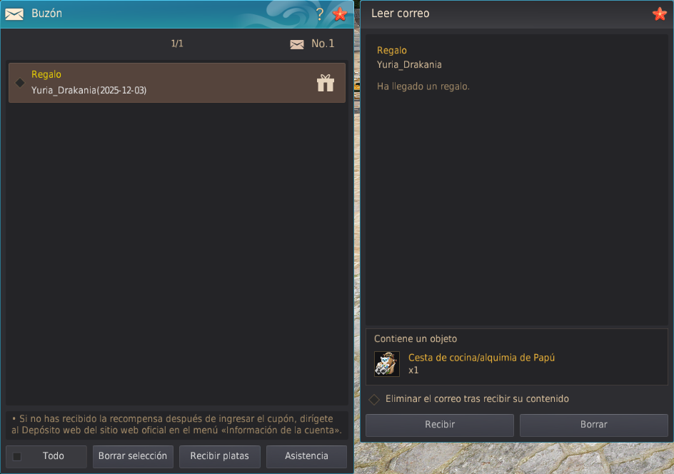 - Por favor, no aceptes regalos de desconocidos o individuos sospechosos. Si recibes un regalo de alguien que no conoces, contacta con la [Atención al Cliente] y no reclames el objeto del Buzón (B).