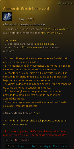 - A los ganadores de la Master Class se les entregará [Cuerno de Eco del cielo azul], y al usarlo, podrán invocar a la montura Eco del cielo azul.