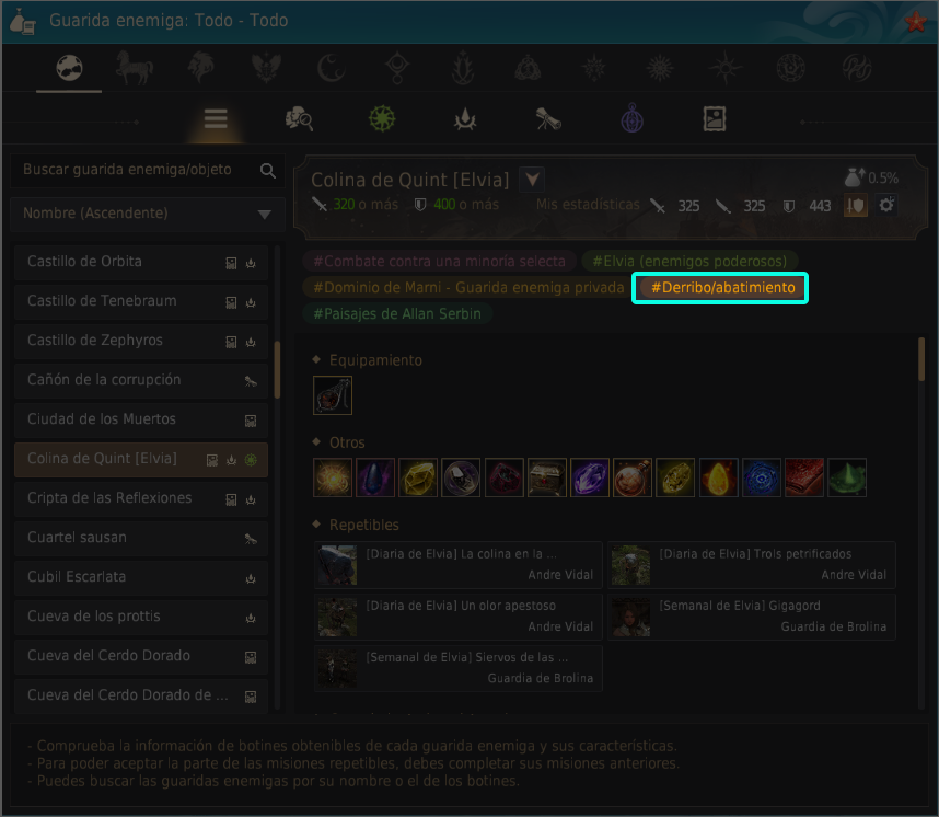 - A través de la ventana de información de guaridas enemigas puedes consultar el tipo de penalizadores que aplican los monstruos en las guaridas enemigas, además de la región de Edania.