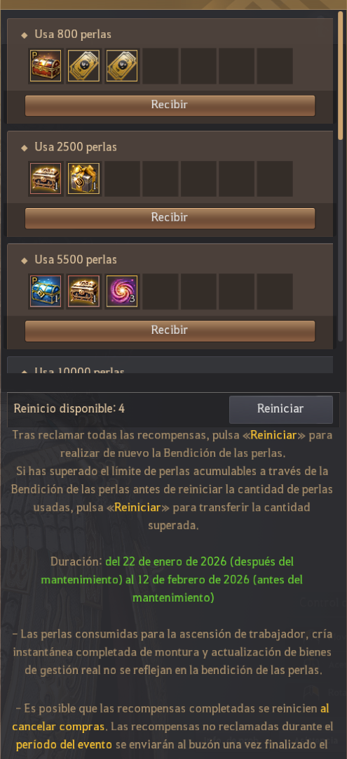 * Las bendiciones de perlas se pueden reiniciar cuatro veces por familia una vez se hayan obtenido todas las recompensas anteriores.