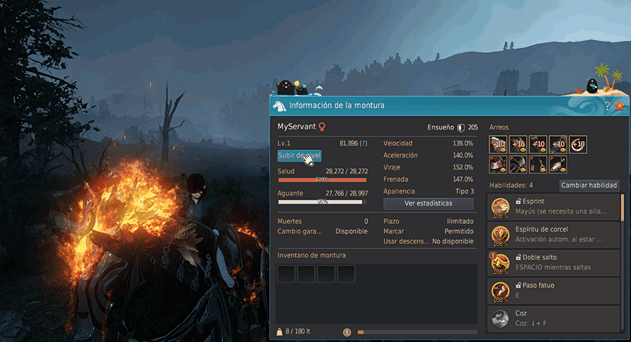 Igual que antes, al subir de nivel una montura, aumentan sus estadísticas (Salud máx., Aguante máx., Capacidad de carga máx., Aceleración/Velocidad/Viraje/Frenada) y existe una probabilidad de aprender nuevas habilidades.