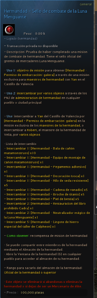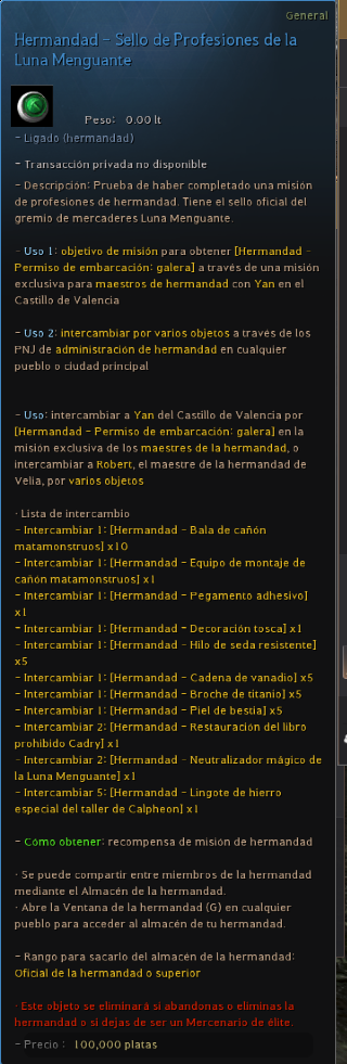 Intercambiar [Hermandad - Sello de combate de la Luna Menguante] o [Hermandad - Sello de Profesiones de la Luna Menguante] o [Azufre] x10 [Langosta] x1 |