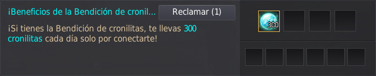 - Las recompensas solo se podrán reclamar si te conectas durante el periodo del evento. - Si usas otras Bendición de cronilitas con el efecto aún activo, se extenderá su duración. |