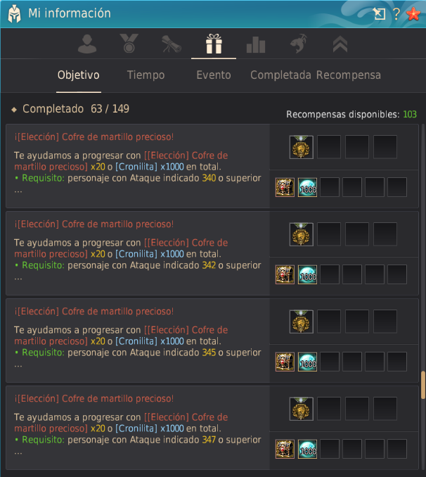 - Cuando completes las condiciones del desafío «¡[Elección] Cofre de martillo precioso!», podrás consultarlo en la pestaña de «Recompensa».
