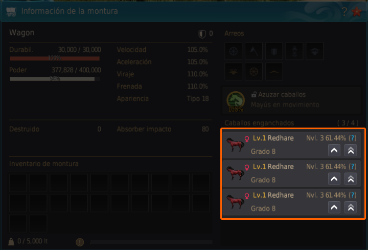 - Se ha añadido el botón «Subir al nivel máx.» en el establo, los caballos y los carromatos.