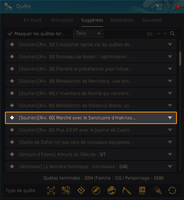 - La quête "[Événement] Marché avec le Sanctuaire d'Hakinza" a été déplacée dans l'onglet "Quête (O) > Quêtes suggérées", et le nom de la quête a été modifié en "[Soutien][Niv. 60] Marché avec le Sanctuaire d'Hakinza".