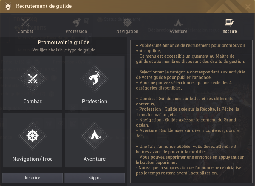Afin d'alléger cette charge, les recettes de fabrication inutiles ont été supprimées et tous les matériaux des recettes restantes ont été convertis en objets communs de guilde. De plus, pour réduire la difficulté liée à l'optimisation de l'équipement des montures de guilde, les niveaux d'optimisation de 1 à 10 ont été supprimés. Enfin, les marchandises vendues dans les boutiques des gestionnaires de guilde et d'approvisionnement militaire de guilde ont été réorganisées pour mieux correspondre aux besoins actuels.