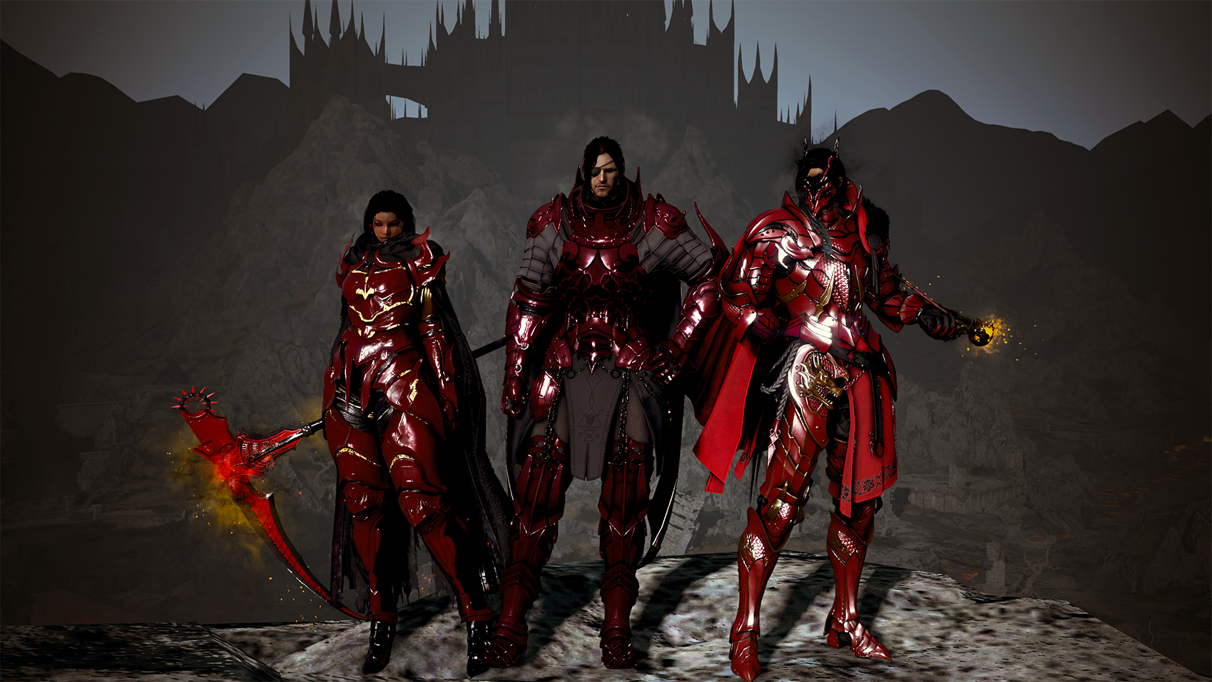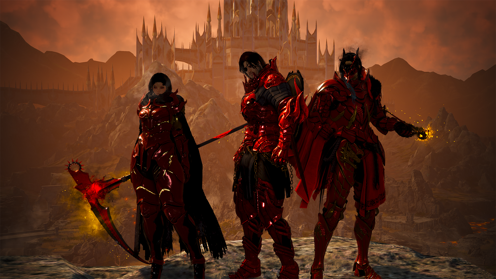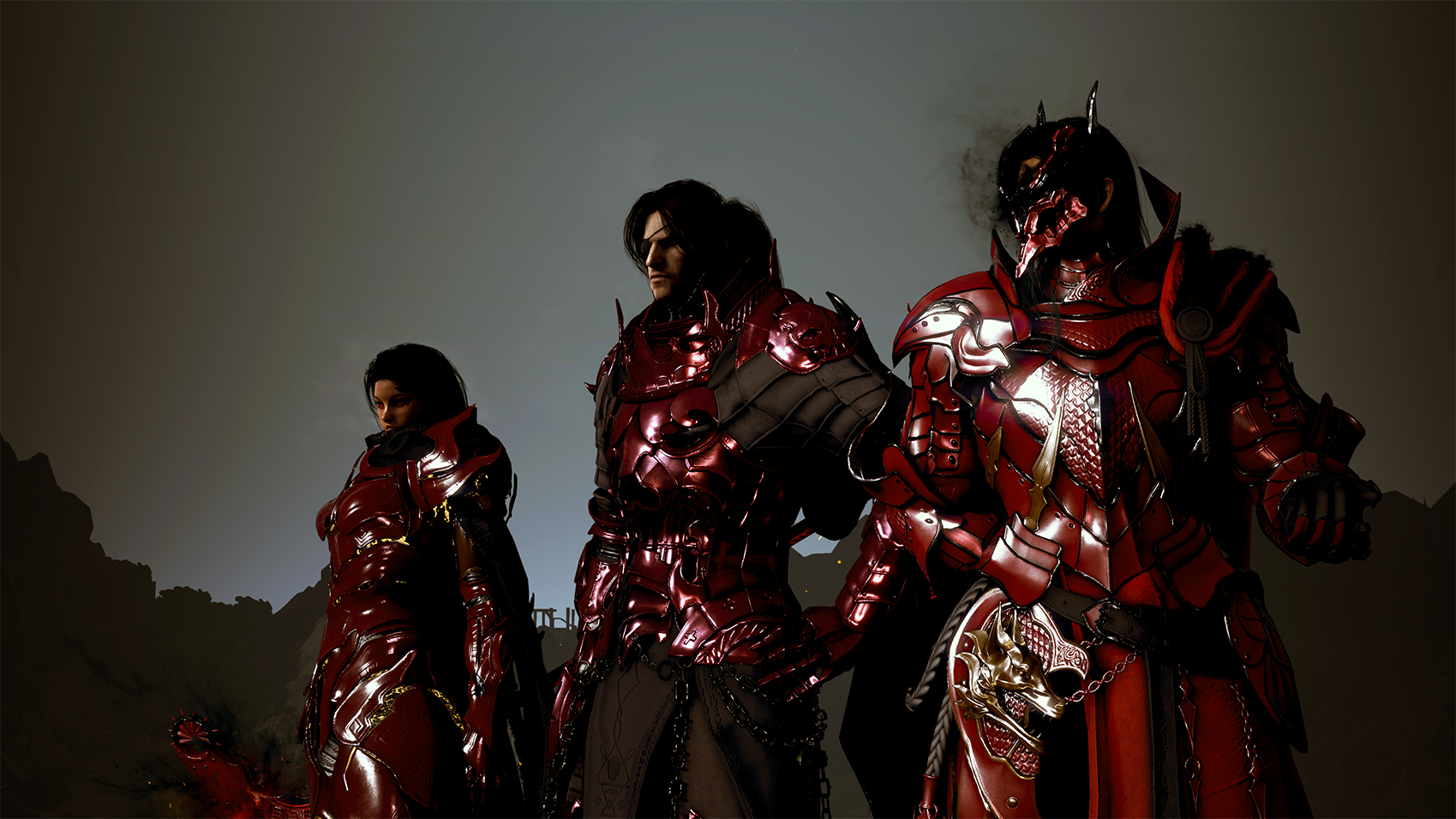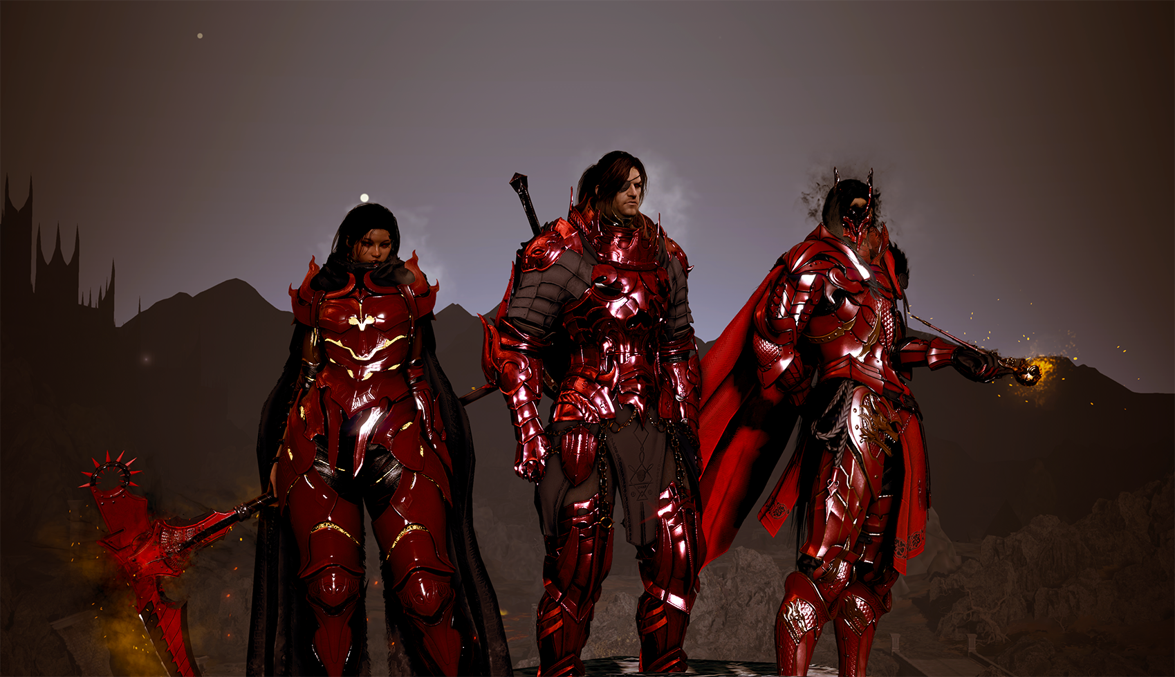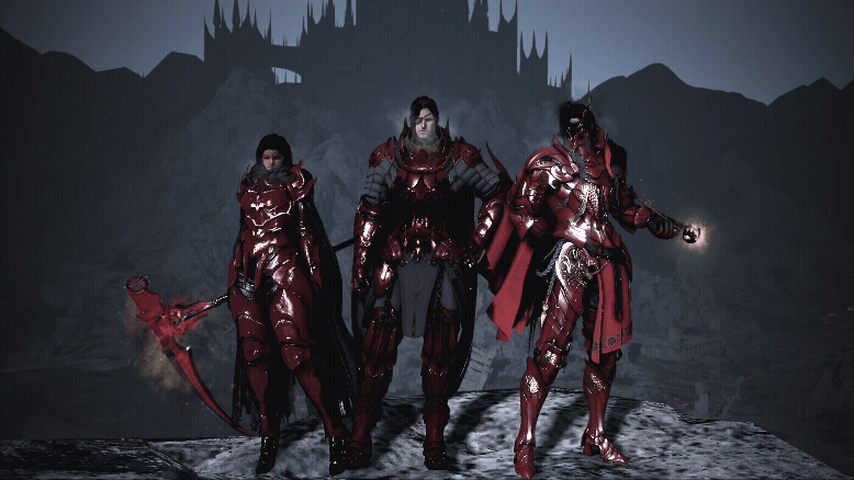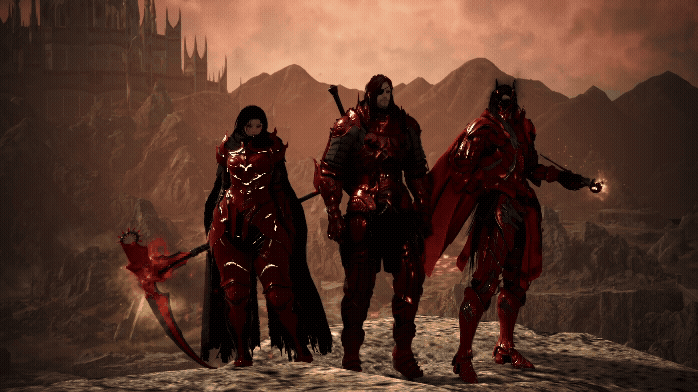 ▲ Les membres de Kinsworn Hunters portant leur uniforme rouge caractéristique