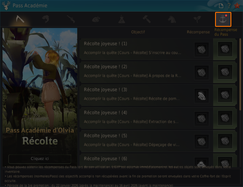 - Correction de l’erreur où le Panneau d'affichage des quêtes de l'Académie d'Olvia affichait d'autres quêtes à certaines heures.