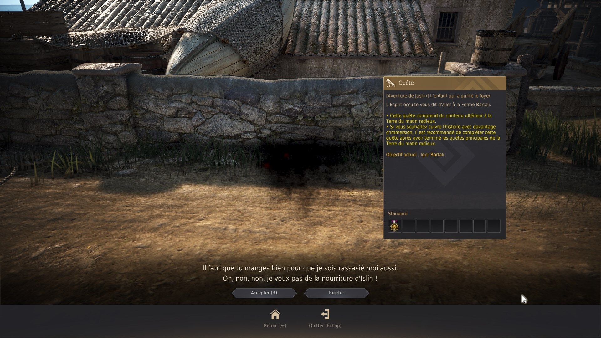 - En progressant dans cette série de quêtes, il sera possible d'accomplir la quête "[Journal d'aventure] Aventures de Justin Bartali", après quoi le Journal d'aventure de Justin Bartali sera débloqué dans [Menu (Échap) - Aventure (F5) - Bibliothèque de journaux d'aventure].