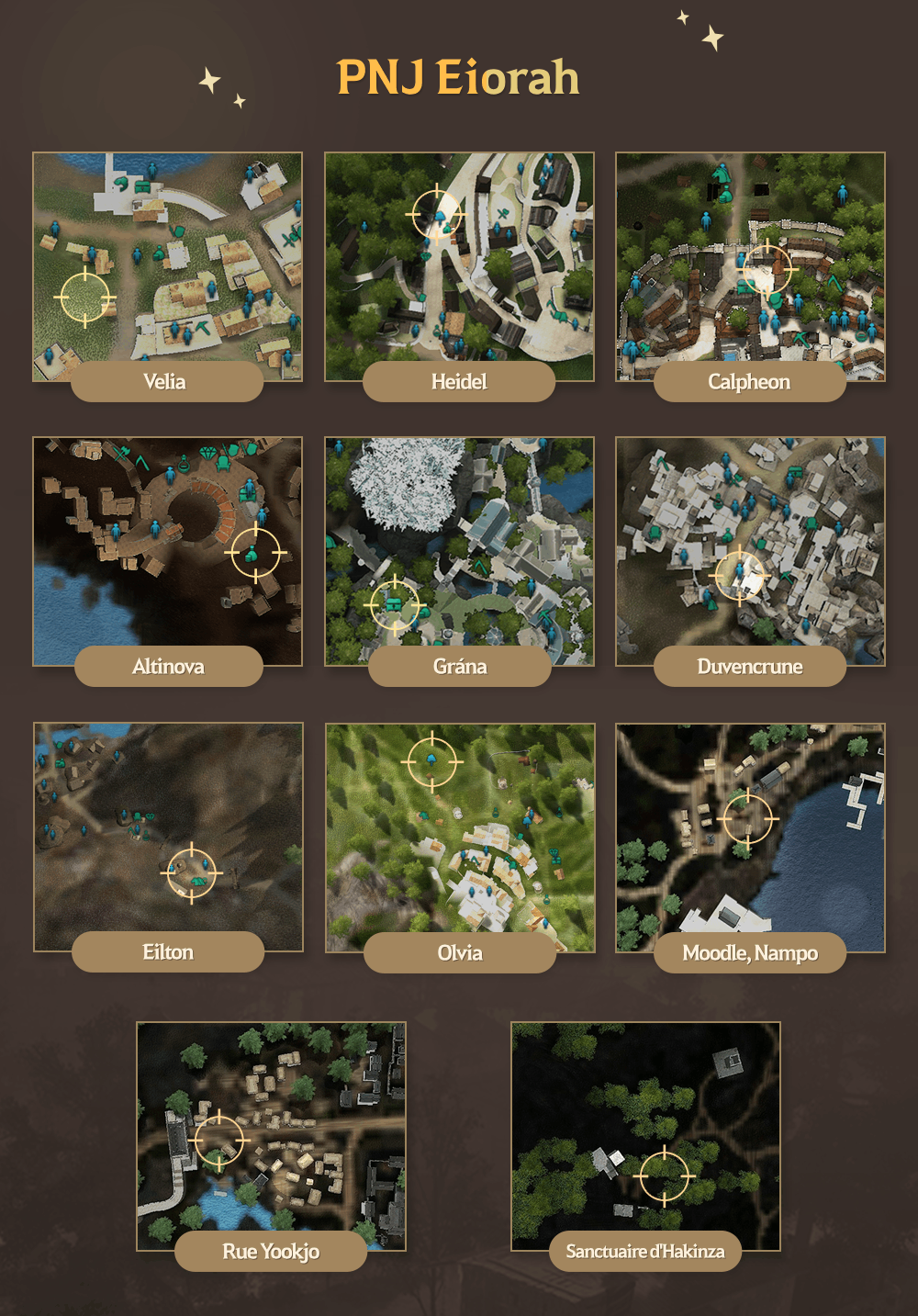 3. - Achetez une variété d'objets et d'équipements auprès d'Eiorah dans les principales villes ci-dessous.