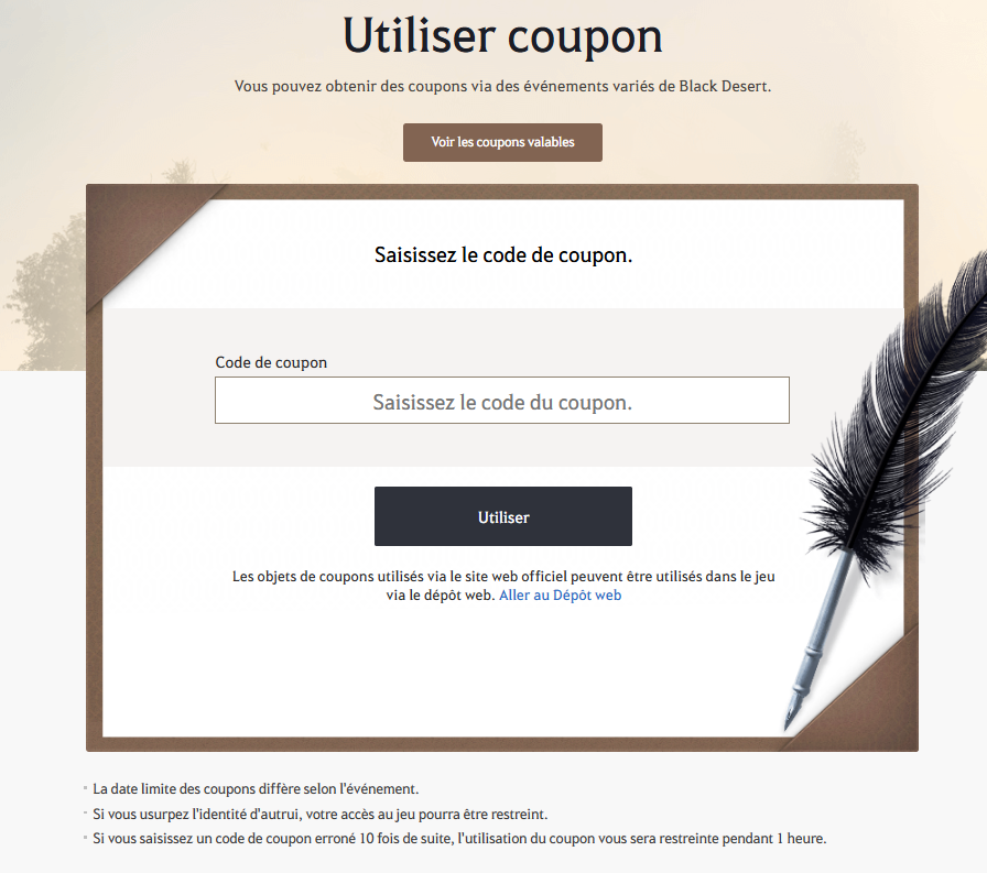 Saisissez votre code via le menu [Utiliser un coupon] pour recevoir vos récompenses par courrier en jeu.